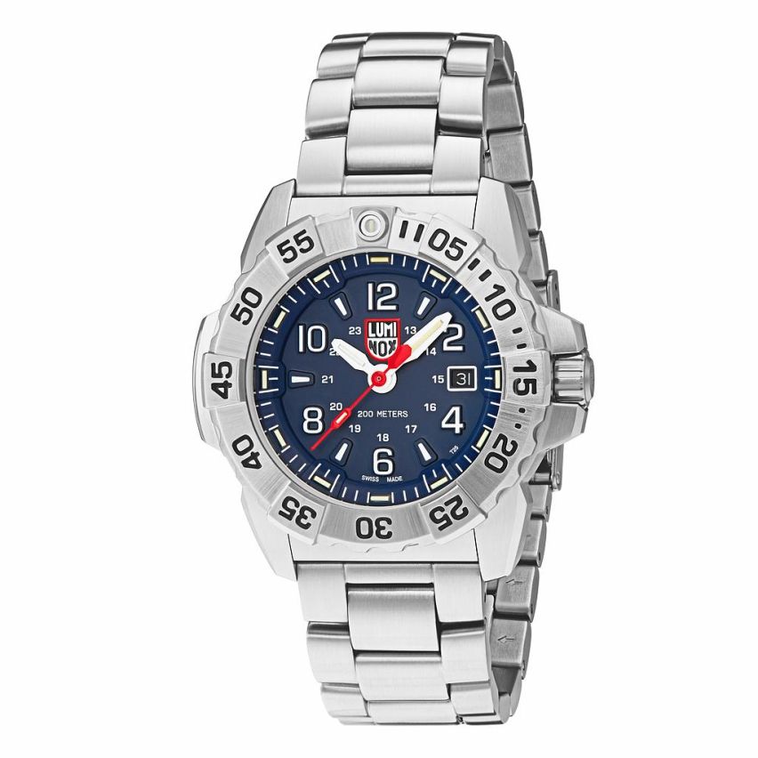 - Luminox Uhr der Navy Seal Serie, hergestellt mit einem 45 mm Stahlgehäuse und Stahlarmband, die bis zu 200 Meter wasserdicht ist.